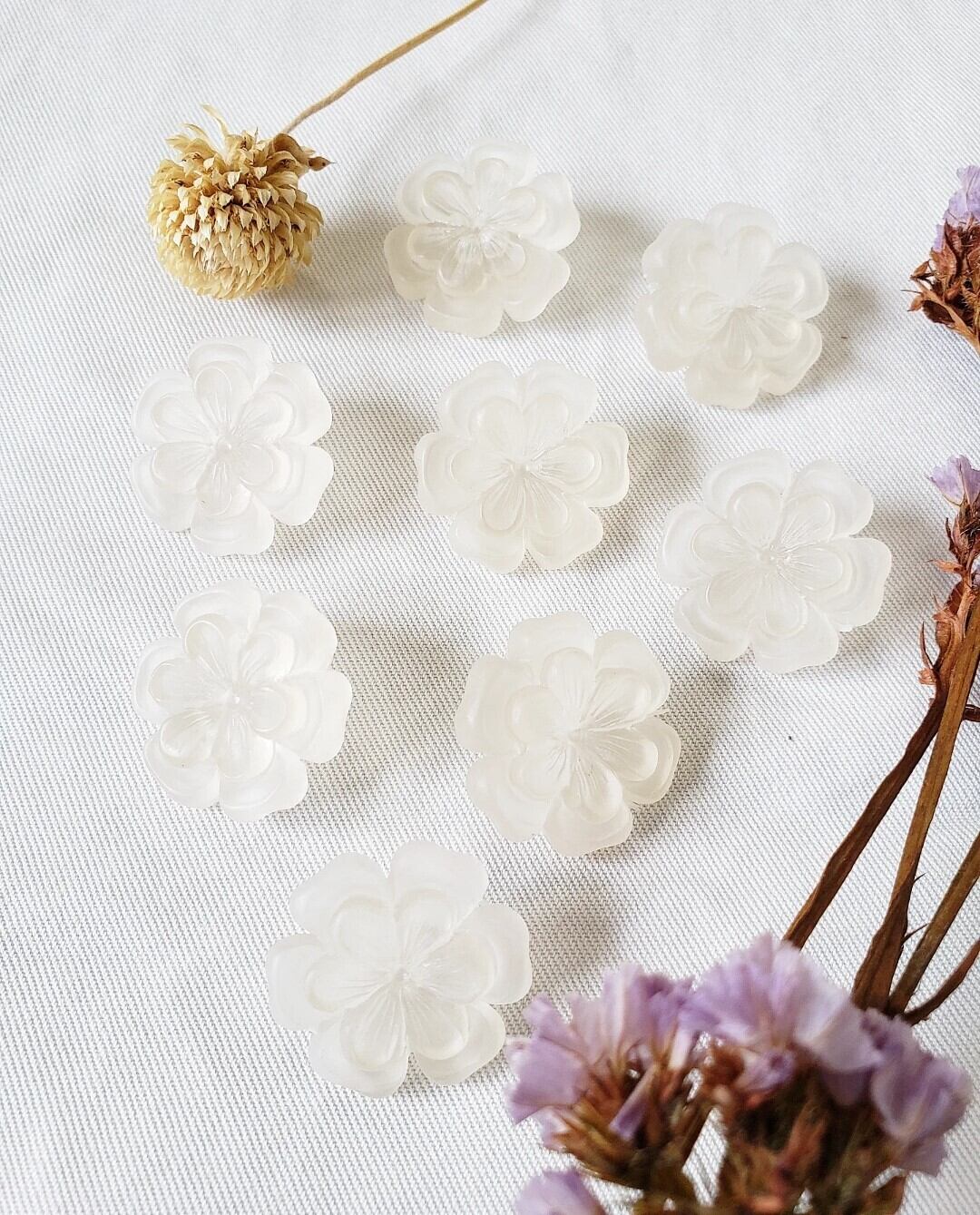 すりガラス風flowerボタン【約23mm】は、半透明のすりガラス風仕上げが特徴の可憐な花型ボタンです。その軽やかなデザインが、あなたの作品に独自の存在感を与え、印象深いアクセントとして活躍します。洋服やバッグ、ハンドメイドアクセサリーにぜひ取り入れて、ナチュラルで優しいスタイルを楽しんでください!