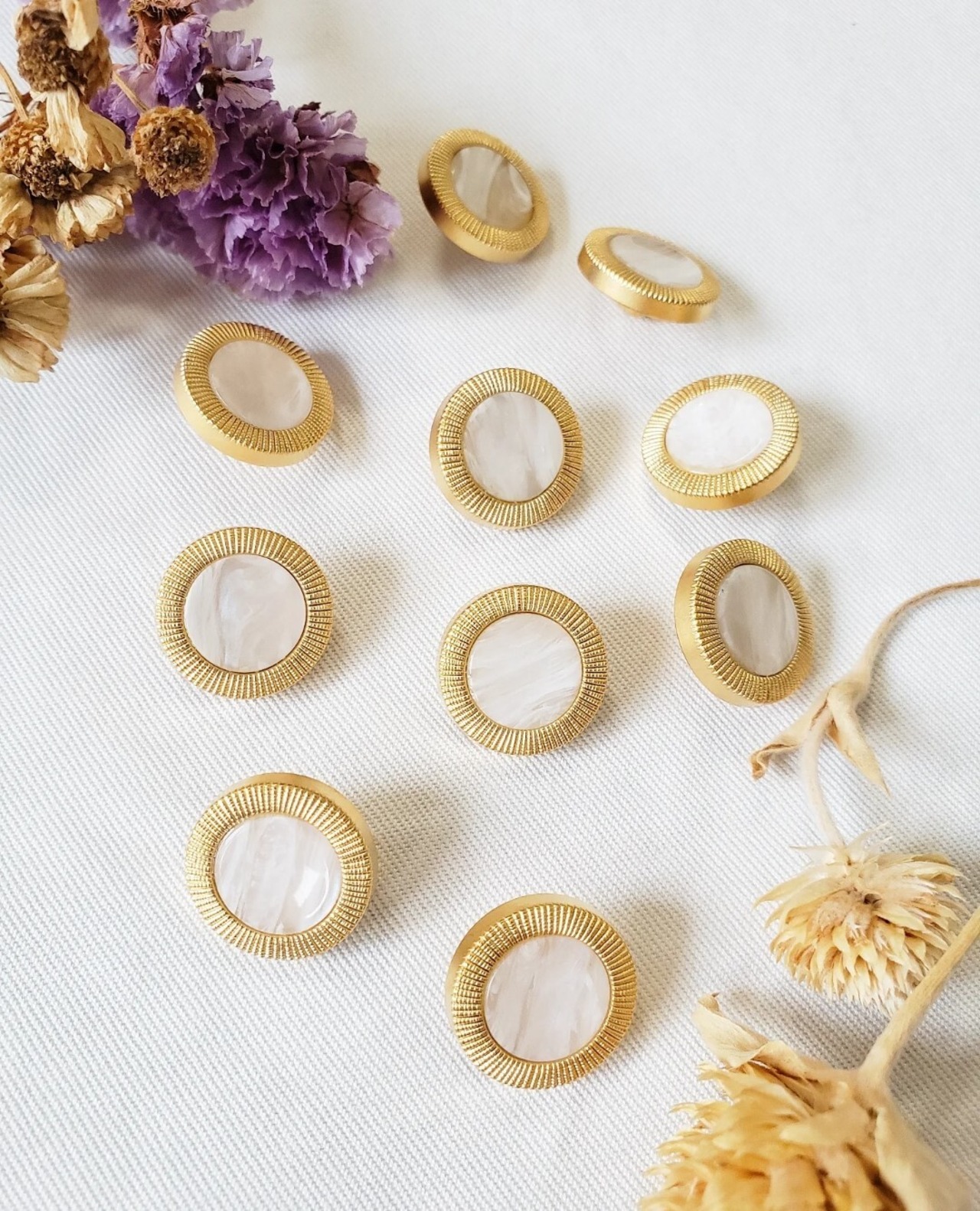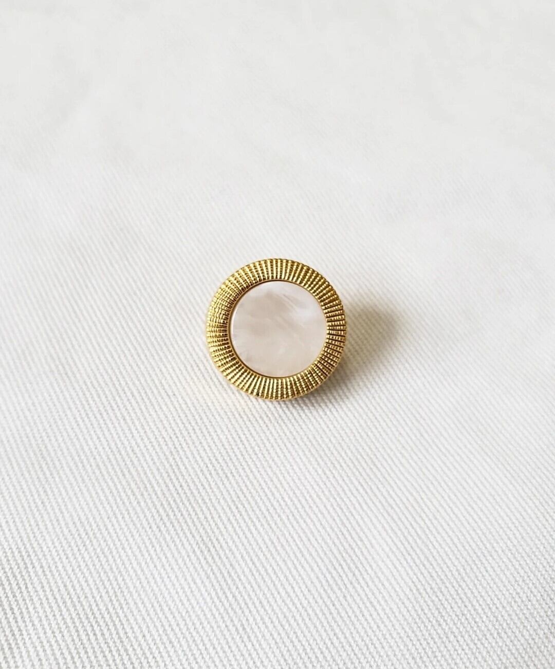 ahaloボタン【約15mm】は、繊細な刻みのあるマットゴールドの美しい仕上げと涼しげな模様の素材を使った魅力のコンビネーションボタンです。そのエレガントなデザインが、あなたの作品に洗練された印象を与え、特別なアクセントとして大活躍します。カジュアルな洋服やバッグ、ハンドメイドアクセサリーにぜひ取り入れて、お洒落で爽やかなスタイルを楽しんでください!