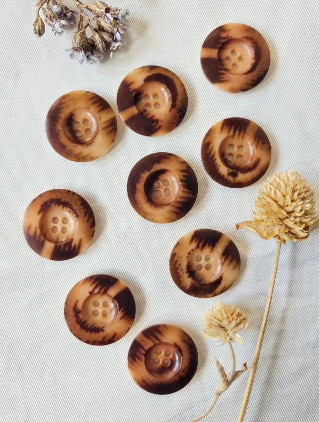 柄入り本ナットボタン【約25mm】は、自然の素材である本ナットを使用し、プリントなのか?焼きによるものなのか?独自のデザインが施されています。倉庫からの掘り出し物で、特別な風合いが魅力です。他では見ないこのボタンはあなたの作品に個性と存在感を加え、独自のスタイルを演出します。カジュアルな洋服やバッグ、ハンドメイドアクセサリーにぜひ取り入れて、あなたのクリエイティブな表現を広げてください!