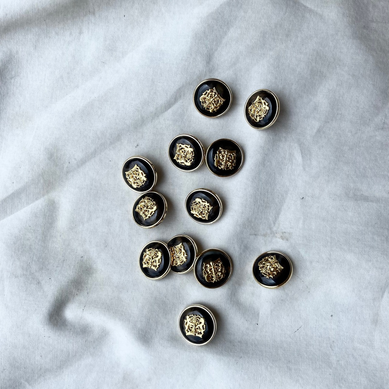 チャコールマーブルのセンターにゴールドのエンブレムを配置した樹脂ボタンです。