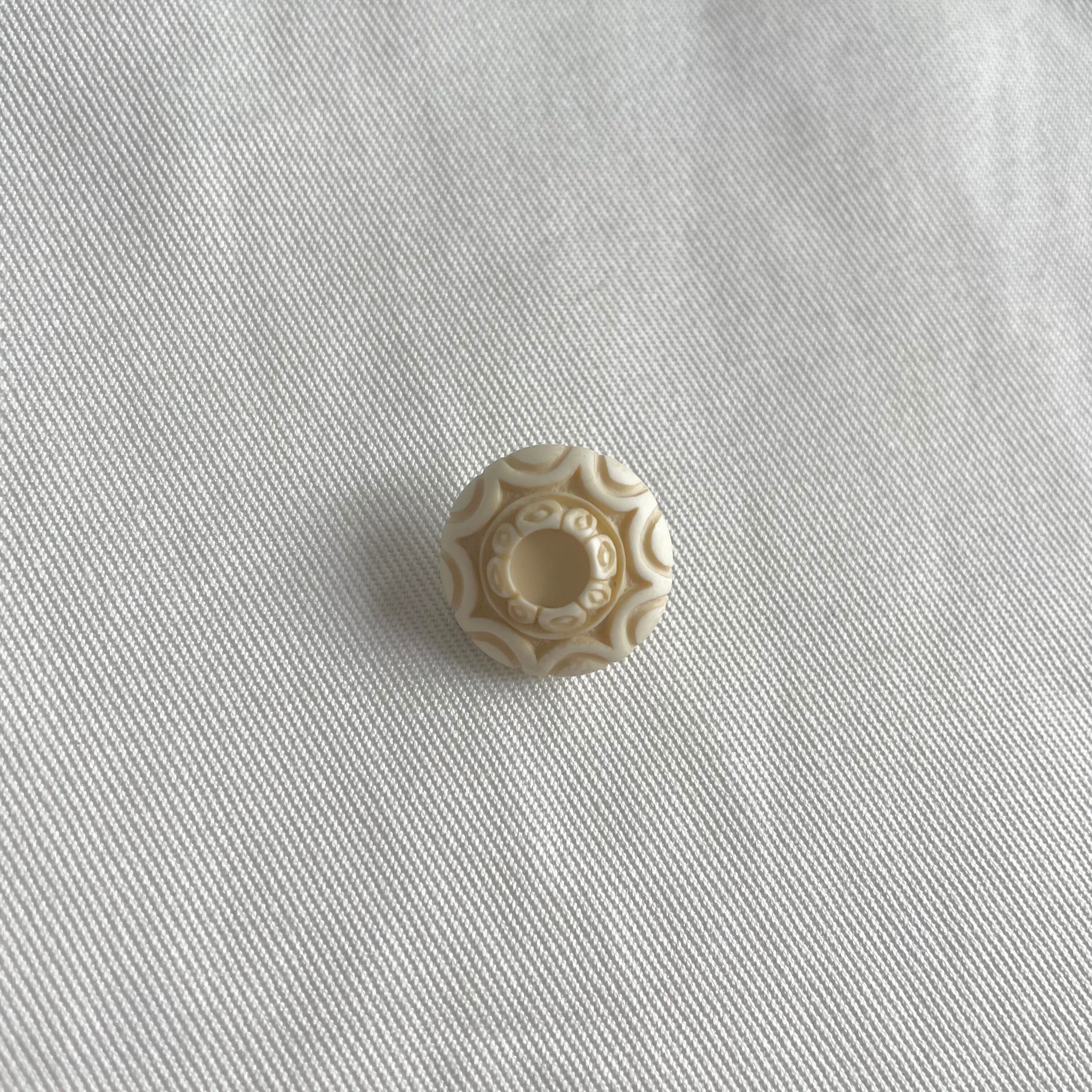ベージュの色入れ加工とトライバル調のほりが民族衣装に使われていそうな雰囲気のあるボタンです✨