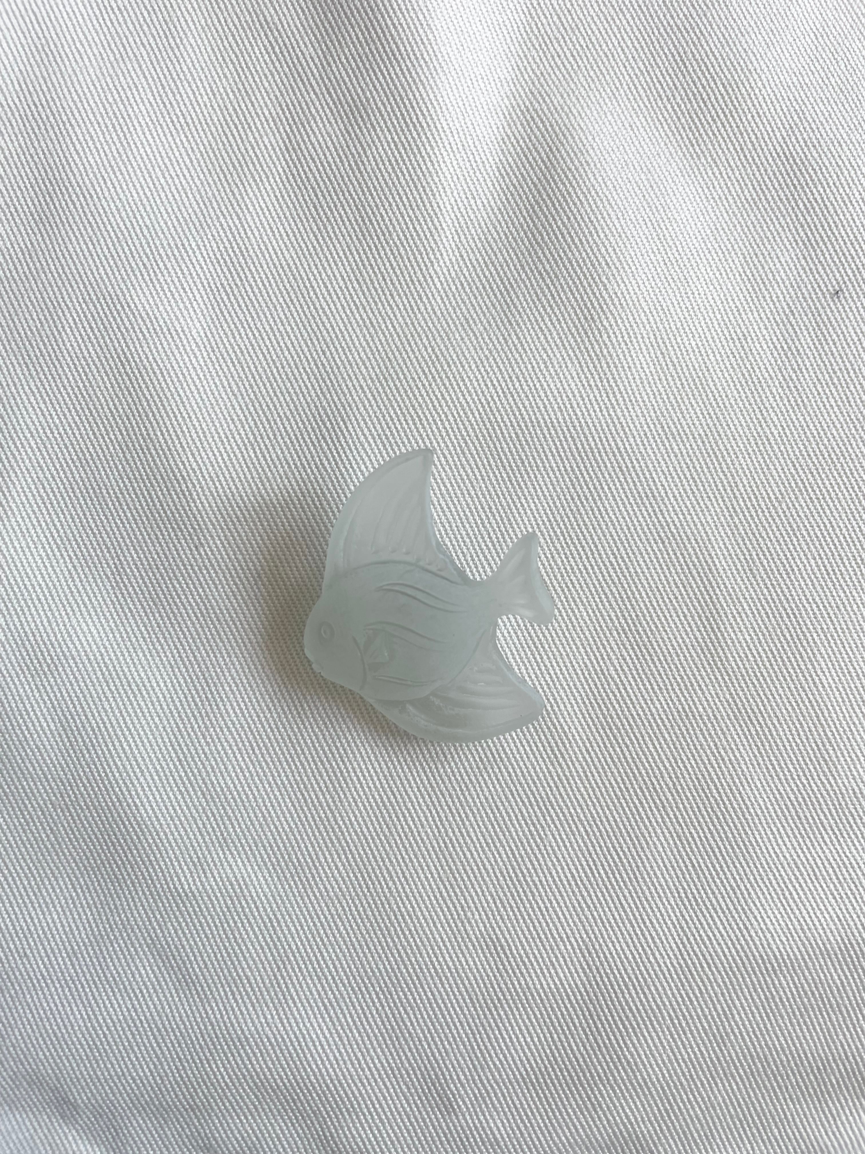 摩りガラスの様にマットで少し青みががった半透明クリアが涼しげなトロピカルフィッシュデザインの樹脂ボタンです。